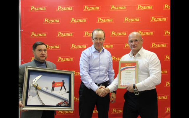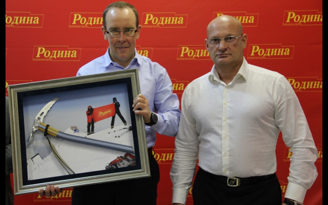 В торжественной обстановке председатель Совета Самарского регионального отделения партии "РОДИНА" Сергей Мирошниченко вручил Леониду Мочалову изготовленный по специальному заказу памятный подарок и благодарственное письмо за продвижение имиджа партии "РОДИНА" при восхождении на Эльбрус.