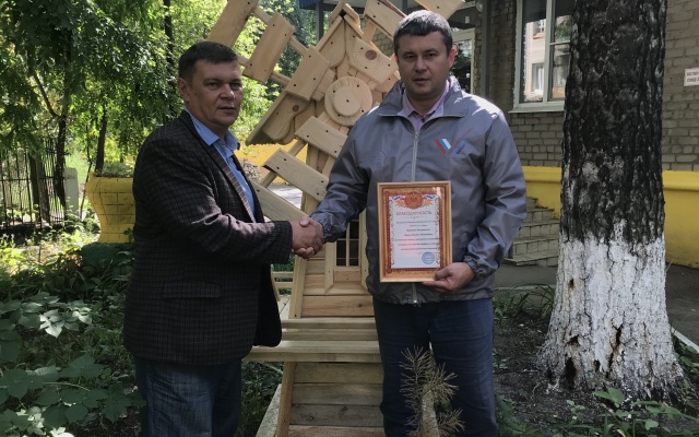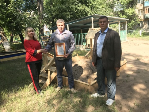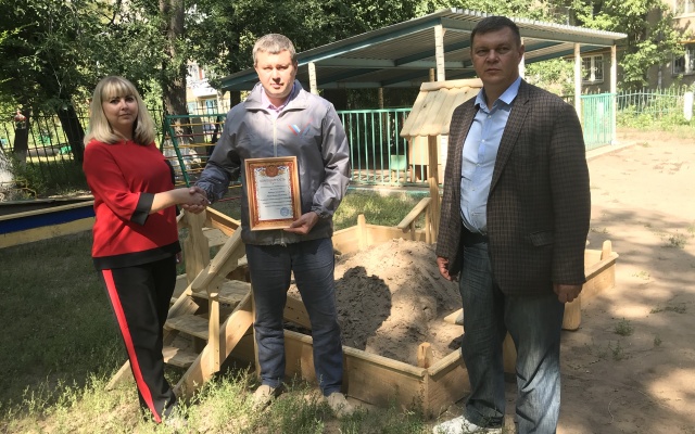 Депутат Думы городского округа Самара от партии "РОДИНА", член регионального Штаба ОНФ в Самарской области Валерий Барсук получил от директора Школы №123 Советского района Сергея Цыганкова и заместителя директора по дошкольному отделению Миланы Вензелевой благодарность за деятельную помощь в обустройстве детской площадки, "расширении игровой зоны, создании комфорта и уюта для воспитанников дошкольного отделения".